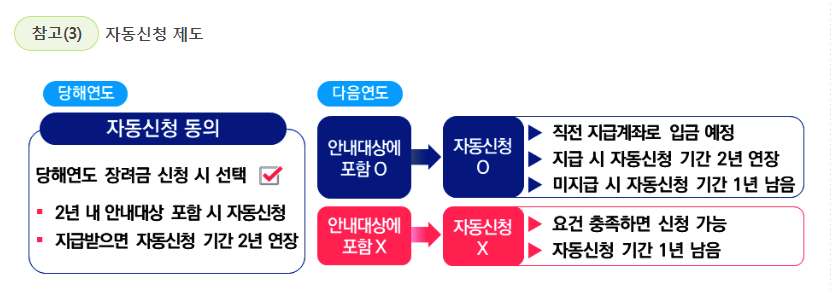 ㉱ 자동신청 제도 : 60세 이상 고령자 및 중증장애인이 장려금 신청기간 내에 동의하면, 2년 자동으로 신청됨