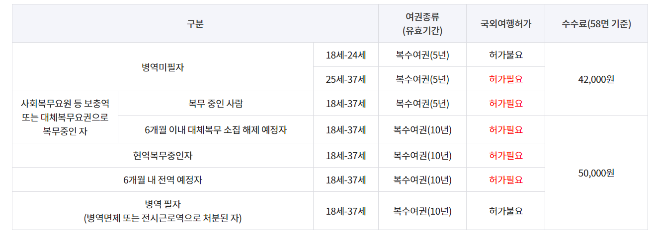 ✔️ 국외여행허가(병무청 발행)를 37세까지 받은 경우 10년 복수여권 발급