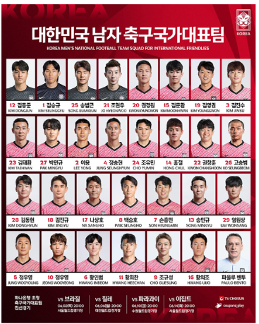 📌 DF : 권경원(수원 FC), 김진수(전북 현대 모터스), 박승욱(김천 상무), 이명재(울산 HD FC), 조유민(샤르제 FC), 최준(FC서울), 하창래(낙야 그램퍼스), 황재원(대구 FC)