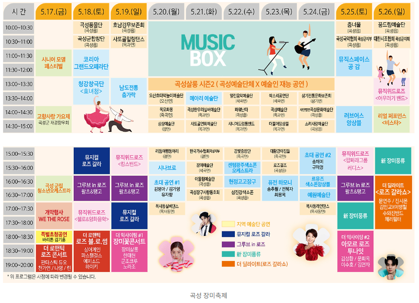 2024년 곡성장미축제는 화려한 초대가수들이 대거 출연합니다. 17일 밤에는 18:30~20:00까지 판타스틱 듀오/천가연/나영/린 가수가 무대를 꾸미고 곡성출신인 트롯트가수 이수호/ 문희옥/ 김연자가수가 화려하게 행사 마지막 토요일을 장식합니다. 그 외에도 다양하고 볼거리가 많은 공연이 준비되어 있습니다.