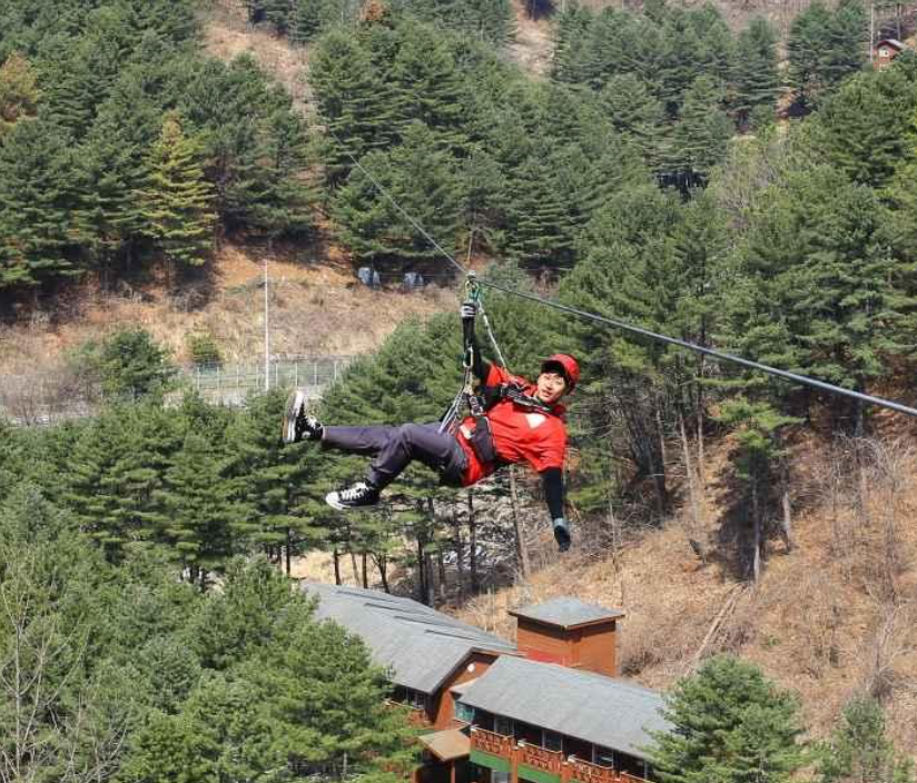 ② 가평 '브리지집라인' 코스 : 총 8개 코스로 전체 길이가 2,418 미터로 우리나라에서 가장 긴 길이를 자랑한다. 짧게는 100미터부터 길게는 500미터대까지, 다양한 길이와 난도의 7개 코스와 상공을 가로지르는 흔들 다리 1개 코스로 구성된 체험 내내 액티비티 하다. 차량을 이용해 상부의 1코스에 올라 집라인을 타고 산과 계곡을 누비며 순식간에 아래로 내려오게 되는데 초반에는 초급자 수준으로 설계하고 후반부는 300미터에서 500미터에 이르는 긴 코스로 집라인의 짜릿함을 맛볼 수 있다. 가장 하이라이트인 7코스와 8코스가 528미터 길이를 자랑하고 후반부로 갈수록 점차 여유가 생기고 주변 풍경도 즐기게 된다.