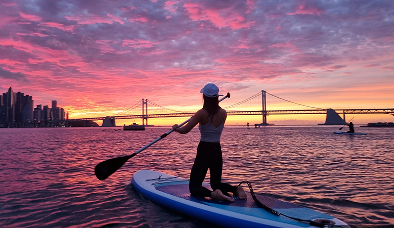 ① 보드 위에 서서 노를 저어 타는 SUP(Stand Up Paddledoard)는 안전하면서도 재미있는 친환경 해양 스포츠다. 초보자도 자연 속에서 힐링의 시간을 즐길 수 있다는 장점이 있다. 광안리해수욕장에서는 바다를 배경으로 환상적인 일출. 일몰을 감상하며 즐길 수 있는 스포츠이고 젏은층에서 선호하는 해양스포츠이다. 물 위 보드에서 무게 중심을 잡아야 하기에 전신운동으로도 효과가 좋다. 물살이 거세지 않으면 바다뿐 아니라 가오가 호수 등에서도 탈 수 있다. 많은 기술이 필요하지 않으며 수영을 못하거나 운동신경이 없어도 누 구아 쉽게 배울 수 있다. 이 계절 광안리 해수욕장에서 즐기는 최고의 방법은 단연 SUP라 할 수 있다. 광안리 해수욕장 해변 일대는 2020년 지역 특화 스포츠산업 육성 사업으로 선정된 이후 SUP특화 해변으로 성장했다. 거친 파도를 가르는 서핑에 비해 배교적 잔잔한 파도 위를 항해하는 움직임이 조용한 스포츠다. 물론 빠르기가 필요한 종목도 있지만 힐링이 목적이라면 오히려 느린 속력이어야 SUP의 매력에 닿을 수 있다. SUP의 가장 큰 장점은 혼자 또 처음이어도 즐길 수 있다는 것이다. 아이는 보호자와 함께 보드에 오를 수 있고 반려견에게도 신나는 여정을 선물할 수 있다. 특히 광안리 해수욕장의 광안대교를 배경으로 아름다운 풍경을 감상할 수 있어서 일출시간에 맞춰 보드에 오르면 붉게 물드는 노을을 배경으로 일상의 스트레스를 날려 버린다.