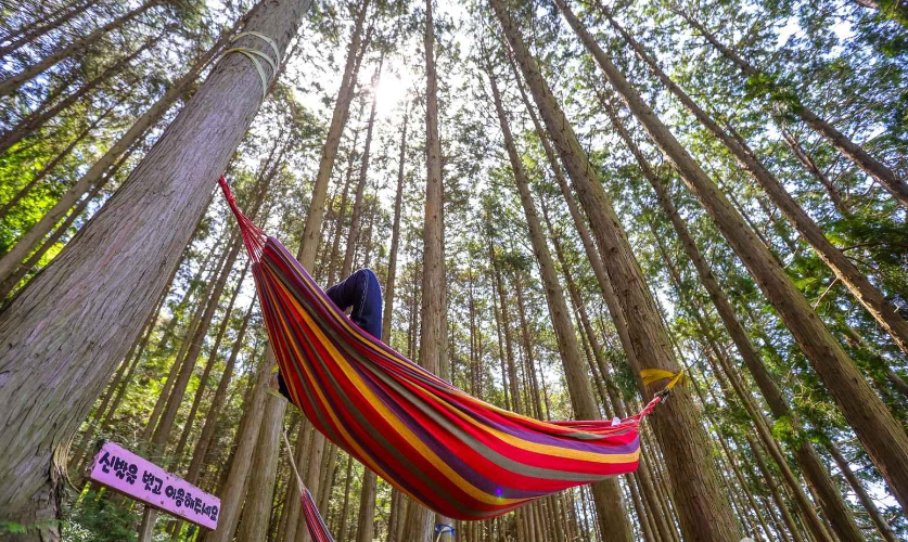 토피아랜드는 4대째 이어오는 개인정원이다. 정원 위쪽으로 올라가면 거대한 편백숲이 나타난다. 편백나무 아래에 놓여있는 푹신한 빈백은 지친 몸을 잡아끈다. 여기저기 아늑한 해먹이 걸려있고 해먹에 몸을 맡기자 까마득히 높은 편백나무 꼭대기에서는 눈부신 초록빛이 수직으로 쏟아져 내린다.